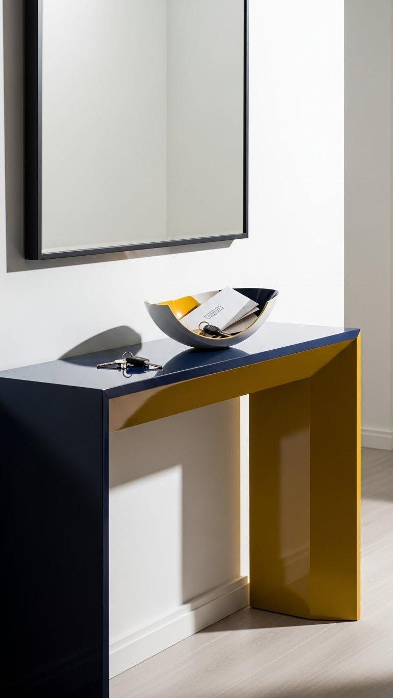 Although glossy lacquer seems bold, it instantly elevates an entryway by reflecting light and sharpening silhouettes. You’ll pair a high gloss finish console with a single sculptural bowl to create contrast and calm. The bowl’s sculptural silhouette anchors keys and mail while acting as art. Choose color that frees the space—monochrome or a bold accent—to keep the look crisp and modern.