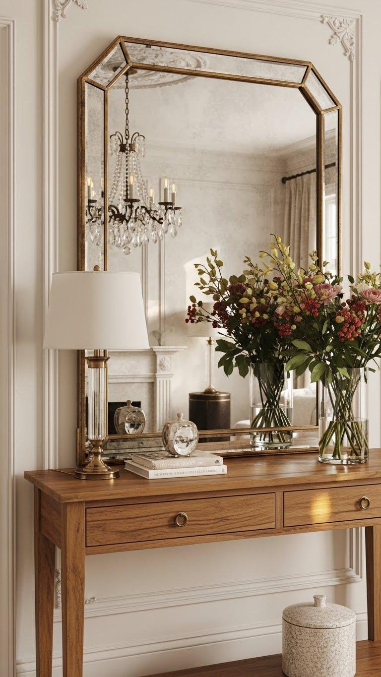 If you want traditional charm with a refreshed feel, a mirror-backed console instantly multiplies light and adds depth while anchoring classic details—think a warm wood console with a beveled or antiqued mirror that reflects moldings, a chandelier, or a vase of seasonal blooms.