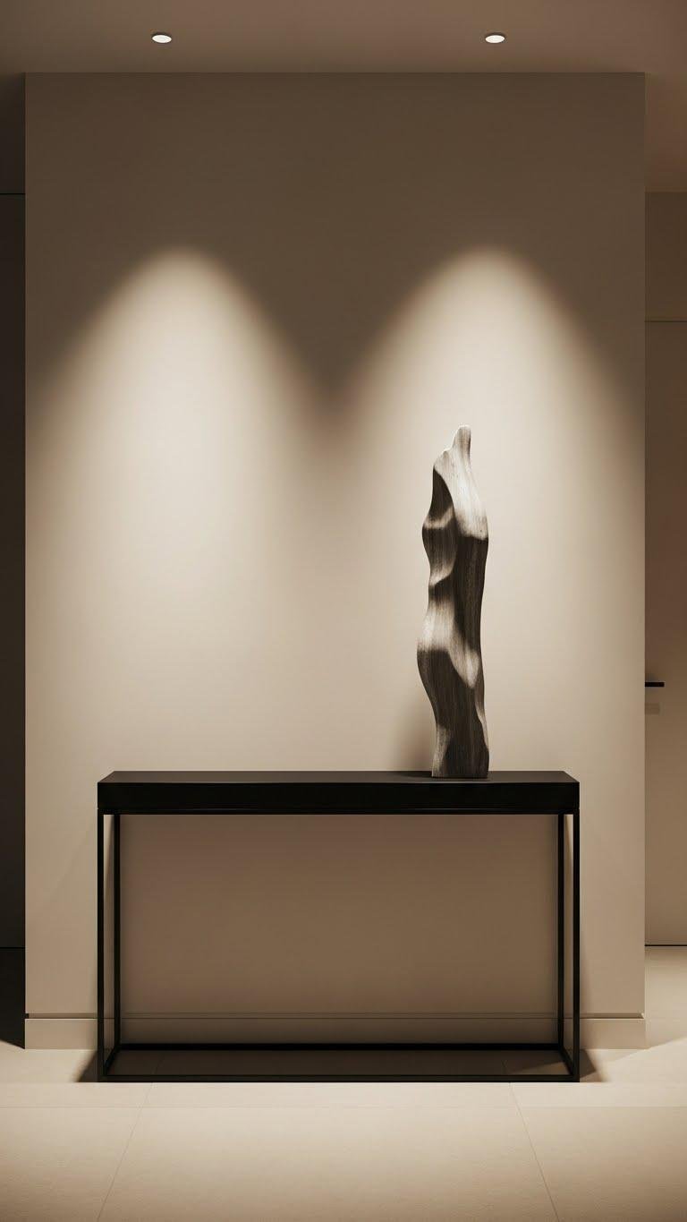 Moving from the tactile warmth of aged books, imagine a slim entry that reads as modern sculpture. You choose a slender console, a single sleek sculpture as a monochrome silhouette, and let negative space breathe. Keep surfaces uncluttered, materials matte or brushed, and lighting minimal but intentional. This lets your entry feel liberated, refined, and quietly confident without excess.