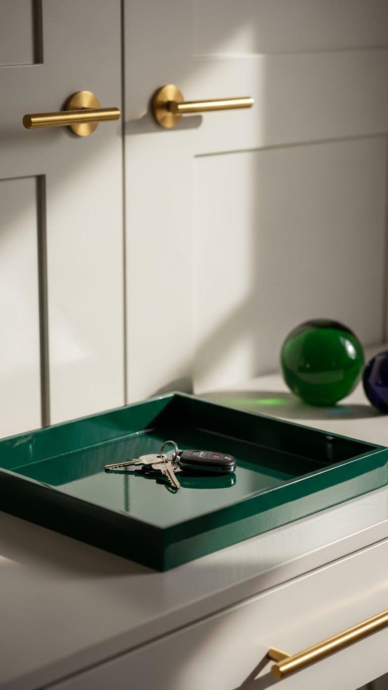 A single glossy tray in deep emerald instantly punctuates your minimalist entry, offering a jewel-toned focal point that keeps keys and small essentials organized without disrupting the calm.