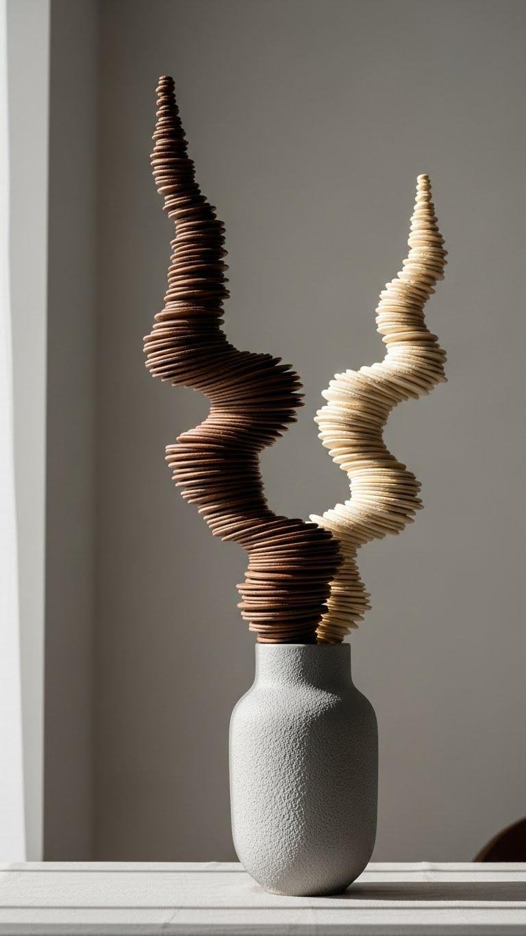 You’ll anchor the entry with textured branches that read sculptural against a pared-back wall, the ceramic silhouette offering tactile contrast.