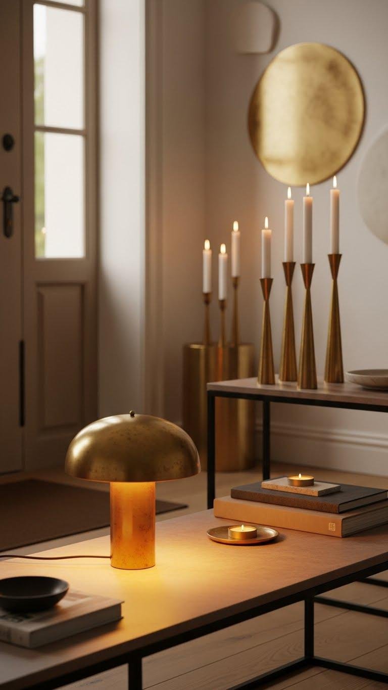 When soft metal meets warm light, brass lamps and candlesticks instantly lift an entryway’s mood and texture. You’ll favor pieces with a warm patina that feel lived-in yet modern. Pair a low lamp and tapered candlesticks to create layered, ambient glow. Keep shapes simple, finishes varied, and placement loose — it lets your space breathe and invites a liberated, stylish welcome.