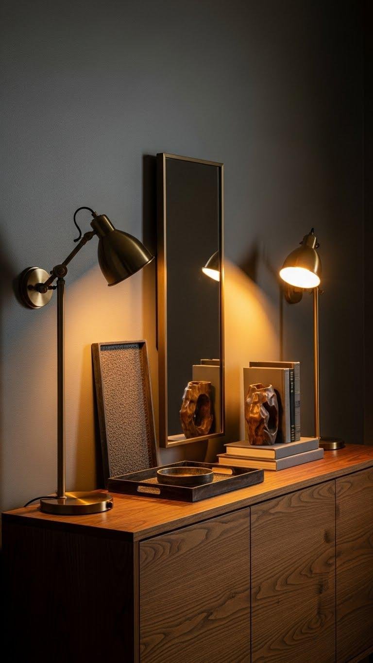 You’ll layer textured trays, a slim mirror, and sculptural books to keep flow. Choose antique brass finishes for patina and create a moody vignette with low, directional light to invite relaxed arrival.