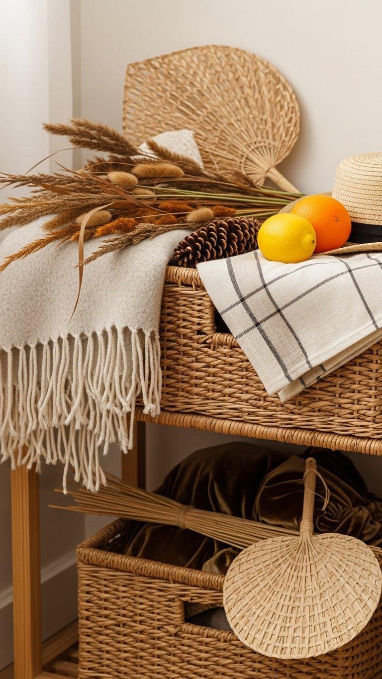 Tuck seasonal accents into the lower shelf basket to shift the mood without overhauling the whole vignette: swap a lightweight wool throw and a few dried grasses for a linen picnic cloth and a bundle of citrus in winter, trade in pinecones and velvet for woven fans and a sunhat in summer.