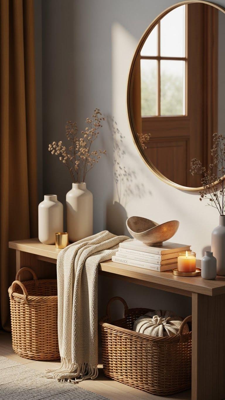 After you’ve played with seasonal swaps on the lower shelf, make the whole entryway tell a story by mixing textures that speak to a mood — think sun-warmed wicker, cool matte ceramic, brushed brass, and a soft knit throw layered with dried florals. You’ll use tactile layering and narrative anchors: a sculptural bowl, a stack of travel books, a candle, and an artful mirror to free the space.