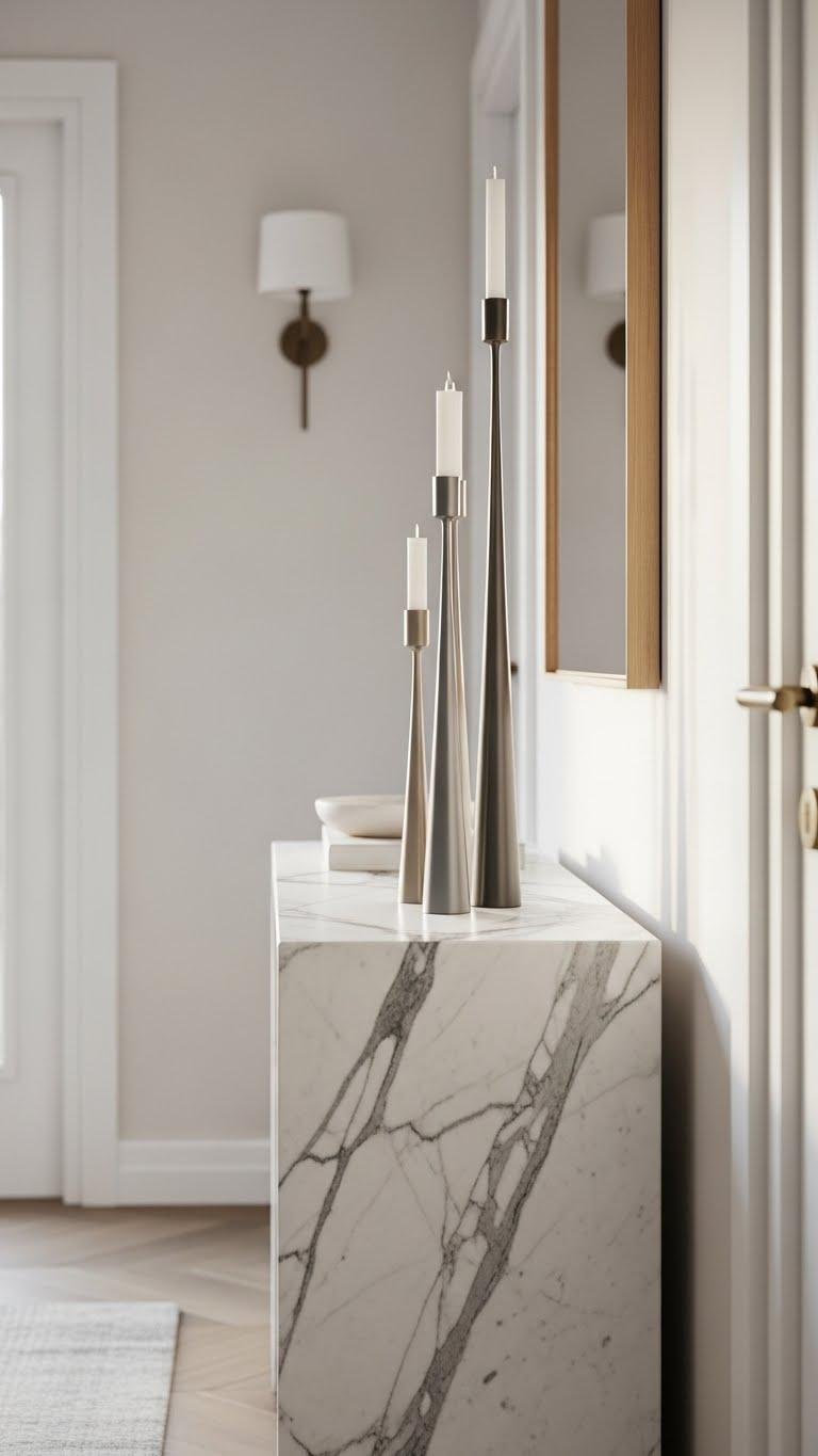 Marble anchors a console with cool, tactile luxury—pair it with tall candlesticks to draw the eye upward and elongate a narrow entryway. You’ll emphasize a marble console’s veining with metal or matte candlesticks, minding candlestick height for proportion. Prioritize candle safety with drip trays and distance from fabrics. Aim for tapered balance: varied heights, slim silhouettes, and uncluttered surfaces that feel liberating.