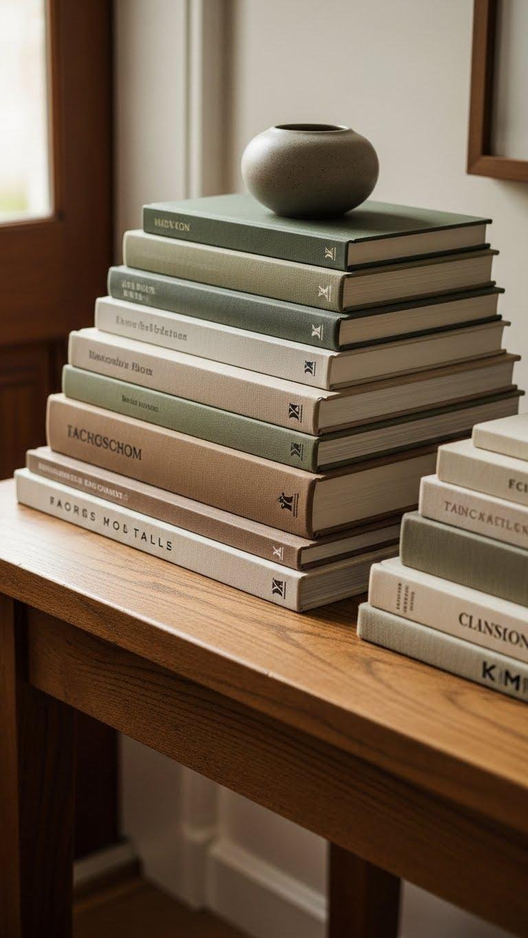 Stack vintage books in uneven stacks to create height and texture, then top one stack with a small sculpture to turn reading material into sculptural decor. You’ll play with antique spines and worn pages for tactile contrast, pairing them with a bronze figurine or similar piece. Keep surroundings airy so the arrangement feels liberated, intentional, and effortlessly curated.