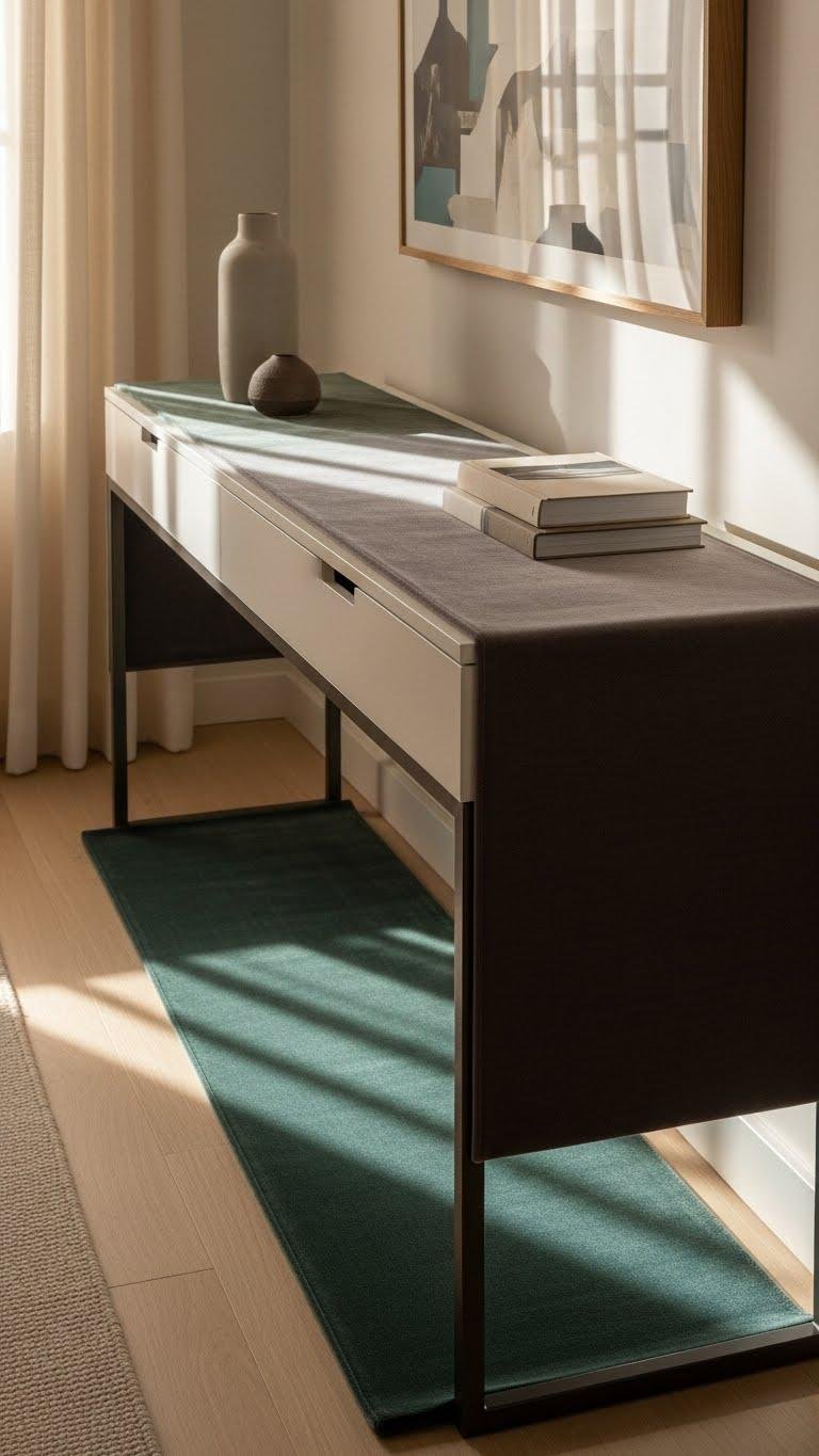 Anchoring your entry with the VINGLI console and a soft velvet runner instantly elevates the space—velvet’s subtle sheen catches morning light, tracing the console’s clean lines and balancing its structured silhouette with tactile warmth. You’ll emphasize velvet texture by choosing muted jewel tones; precise runner placement down the center adds flow without clutter. Keep accessories minimal to let material and form breathe.