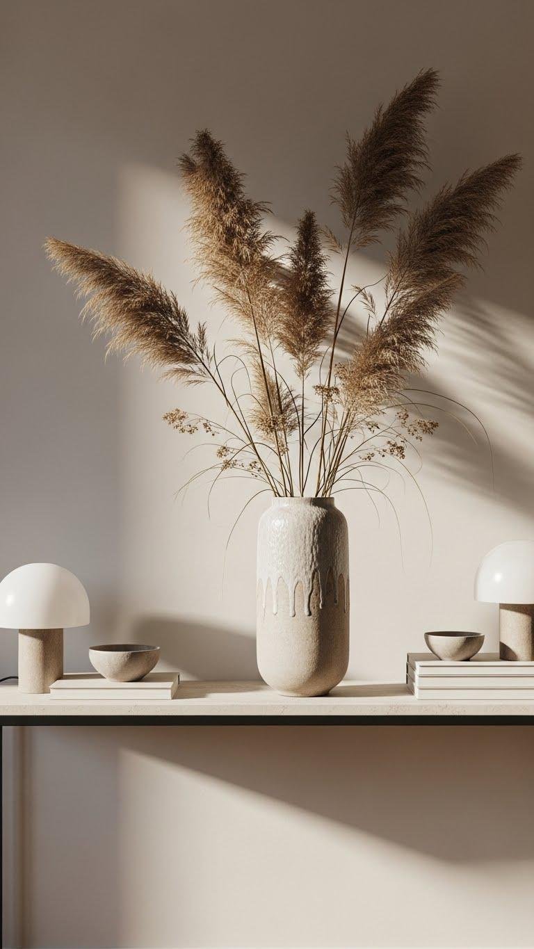 Place a tall ceramic vase filled with wispy pampas grass at one end of the console to introduce verticality and soft texture that contrasts the low-profile lamps. You’ll create a boho contrast that feels free and curated; pick neutral glaze, varied plume heights, and pair with matte accents. Maintenance tips: dust lightly, avoid moisture, trim stems seasonally to keep the silhouette crisp.
