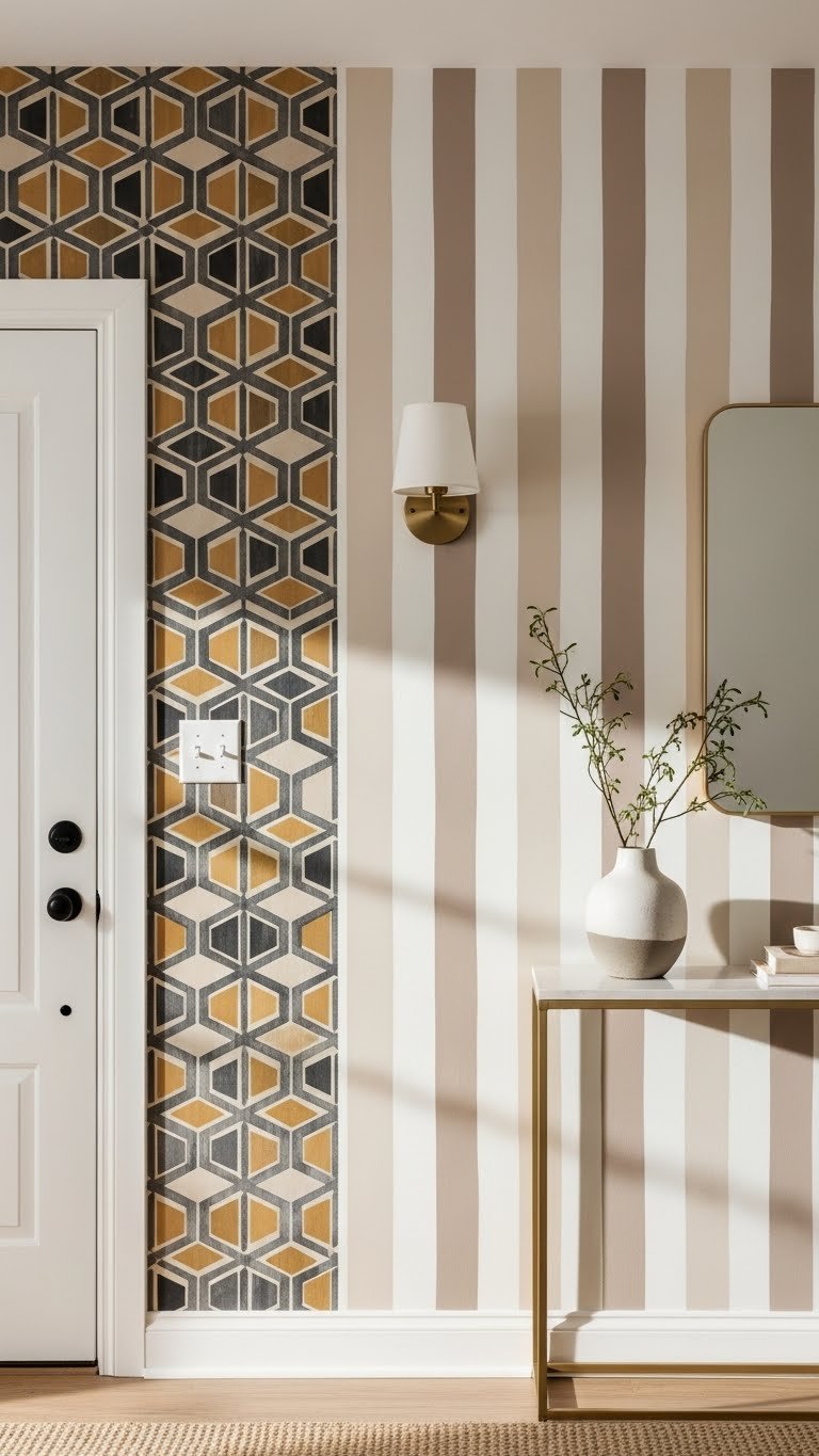 When you mix patterned wallpaper with hand-painted stripes, you get an entryway that feels curated rather than chaotic—each motif plays off the other to create rhythm and depth. You can balance bold prints with subtle ombre stripes, using geometric layering to guide sightlines. Choose a restrained palette, commit to clean lines, and let the wall express confident, effortless freedom without overpowering the space.
