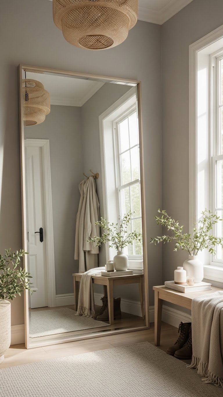 Bring a large mirror into your entryway to instantly open the room and bounce light around, making even a narrow foyer feel airy and welcoming. Choose an oversized frame for bold scale and use light reflecting glass to amplify brightness. Try leaned placement against the wall for relaxed elegance, creating a confident entrance focal point that feels freeing, functional, and effortlessly chic.