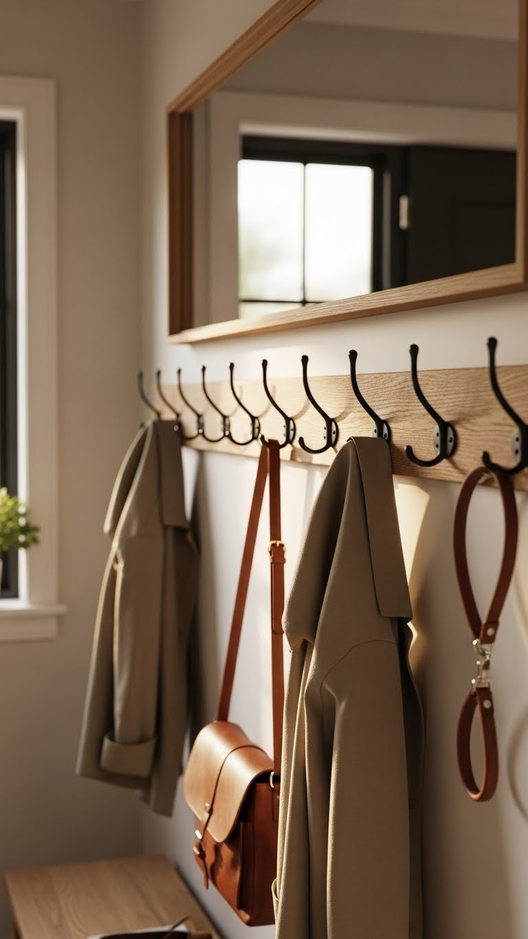 Mount a sturdy minimalist bar with rustic hooks to corral coats, bags, and dog leashes. You’ll create a clean, functional focal point that feels freeing—simple to use, bold in design, and built to last.