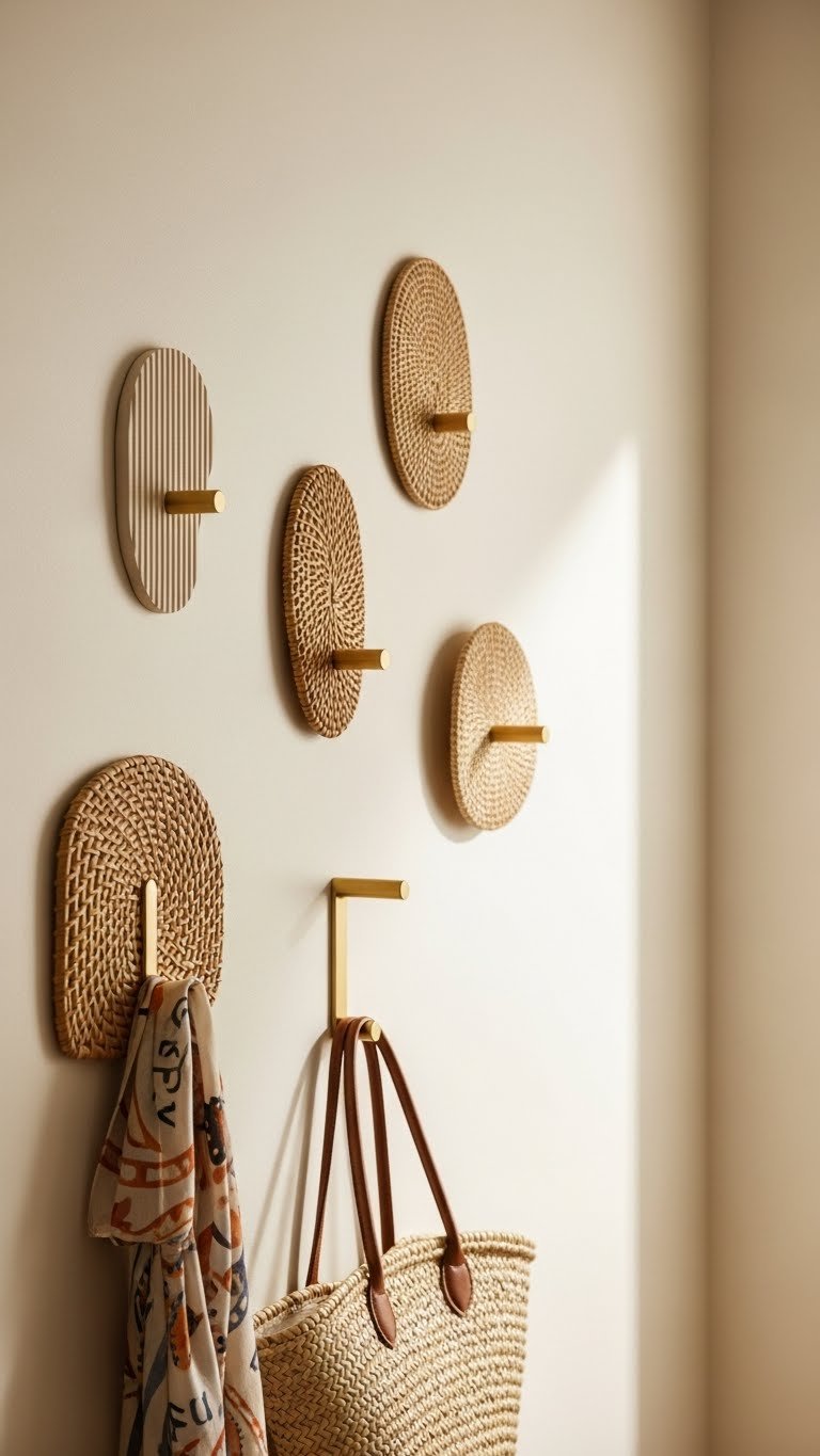 If you like the tidy look of mounted wicker baskets but want something more sculptural, wall hooks that read as art give you form and function in one move.