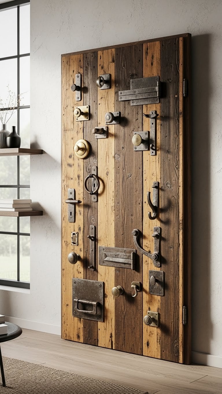 If you loved the clean lines of floating shelves, bring that same curated restraint to your entry with a reclaimed wood door display that feels both lived-in and deliberately styled. You’ll mount a salvaged hardware display—knobs, hinges and hooks arranged like art—then add patina finish accents for subtle drama.