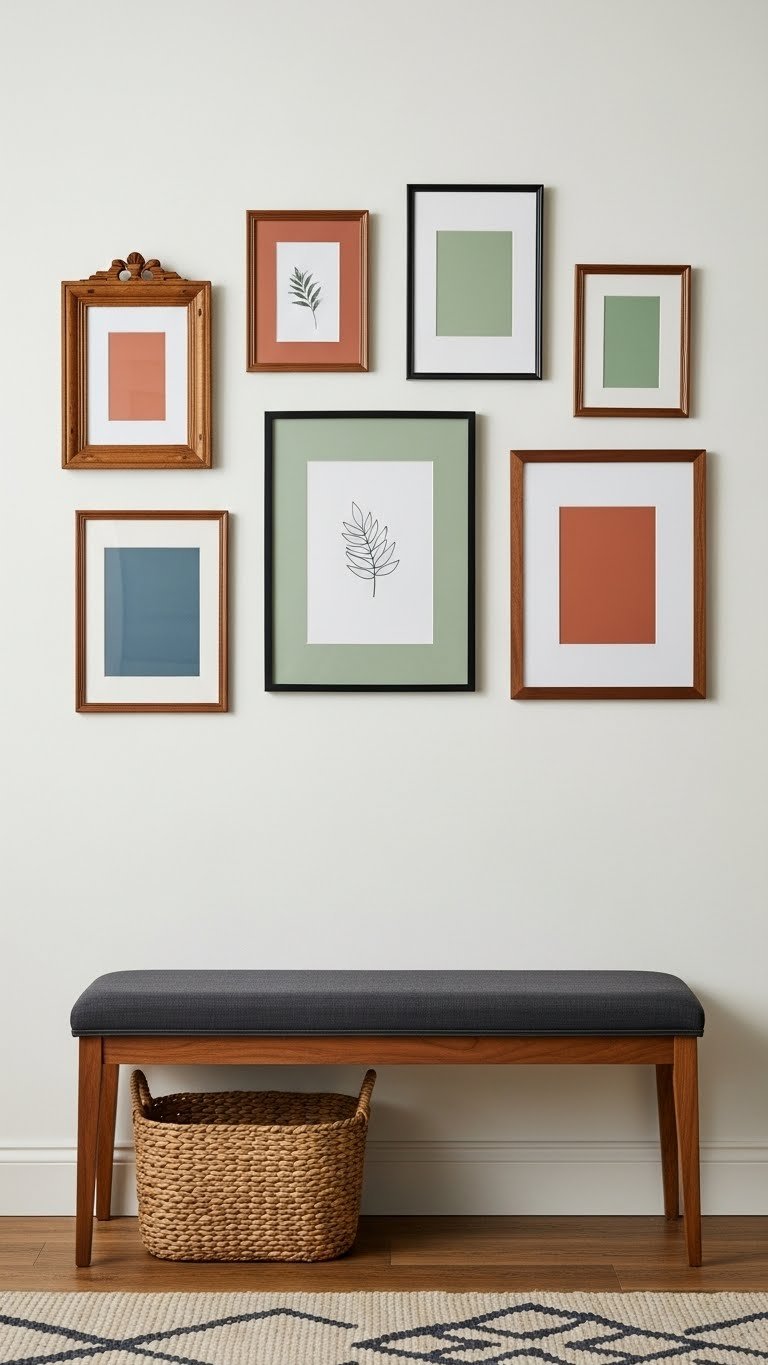 When you pair mismatched frames around a single, restrained palette, the result feels intentionally collected rather than chaotic. You’ll mix vintage profiles, sleek metals, and warm woods, using mismatched matting to unify pieces.