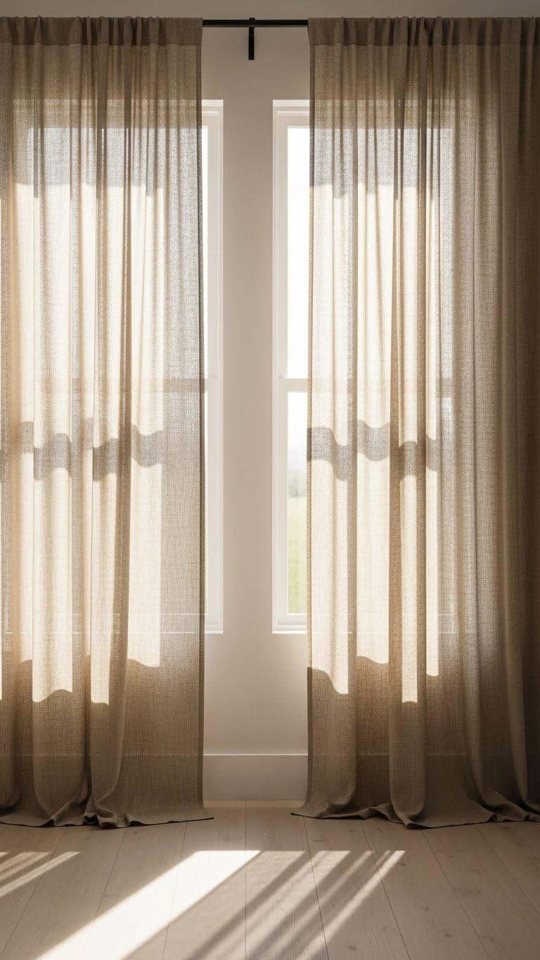 Floating at the edges of sunlit windows, organic linen curtains filter light with a soft, breathable texture that keeps rooms feeling open and calm. You’ll choose a breathable weave to encourage airflow, embrace subtle linen dyeing tones for natural warmth, and hang panels with relaxed hems for movement. They frame views without confining you, pairing minimalist hardware with effortless farmhouse ease.
