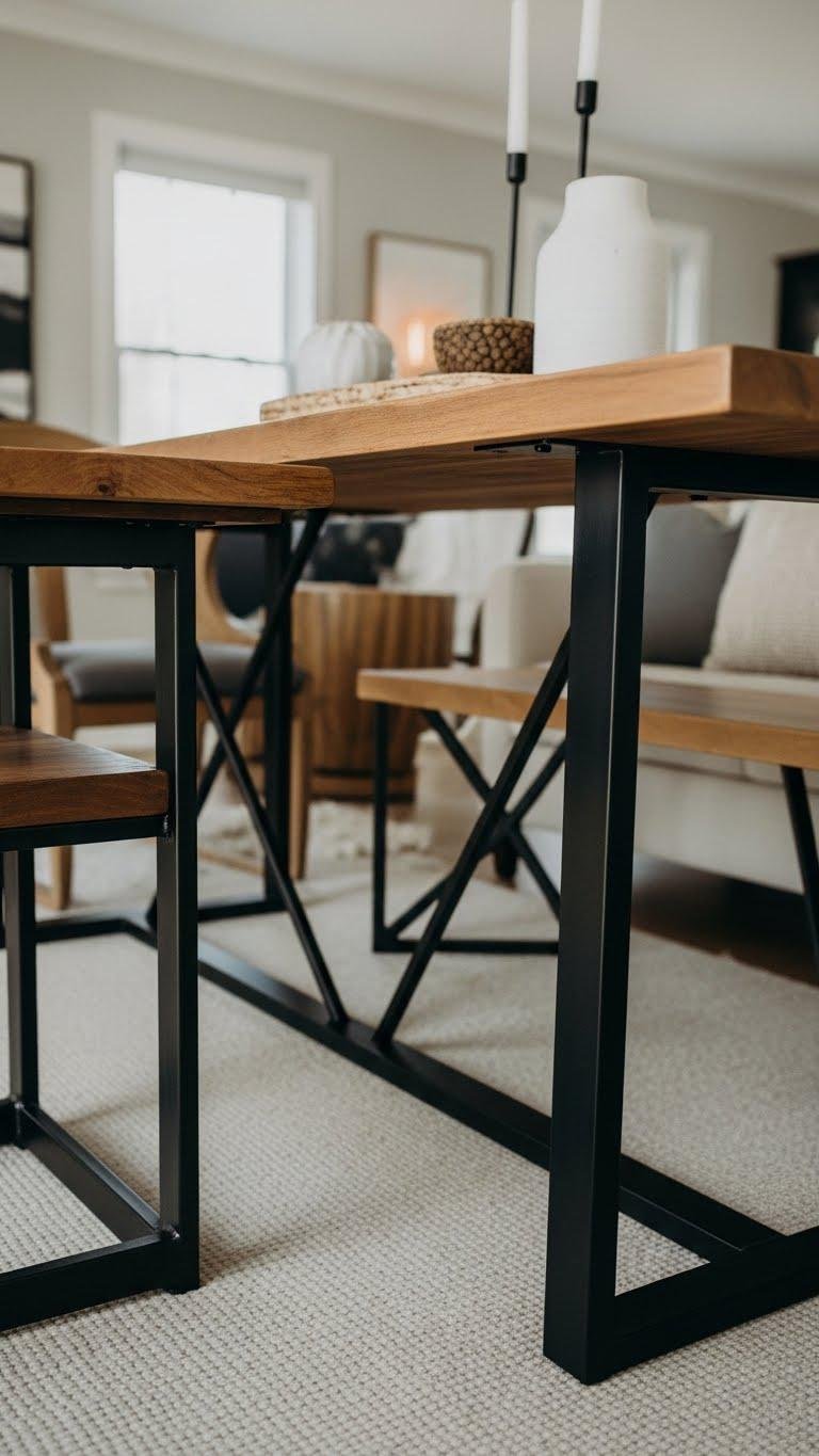 Anchor your cozy farmhouse pieces with black metal table legs for a fresh, modern contrast that still feels grounded. You’ll choose industrial legs or sleek geometric bases to add edge without losing warmth. Mix reclaimed wood tops with matte black frames, keep lines clean, and let freedom guide placement. This pairing modernizes your space while honoring rustic comfort and personal expression.