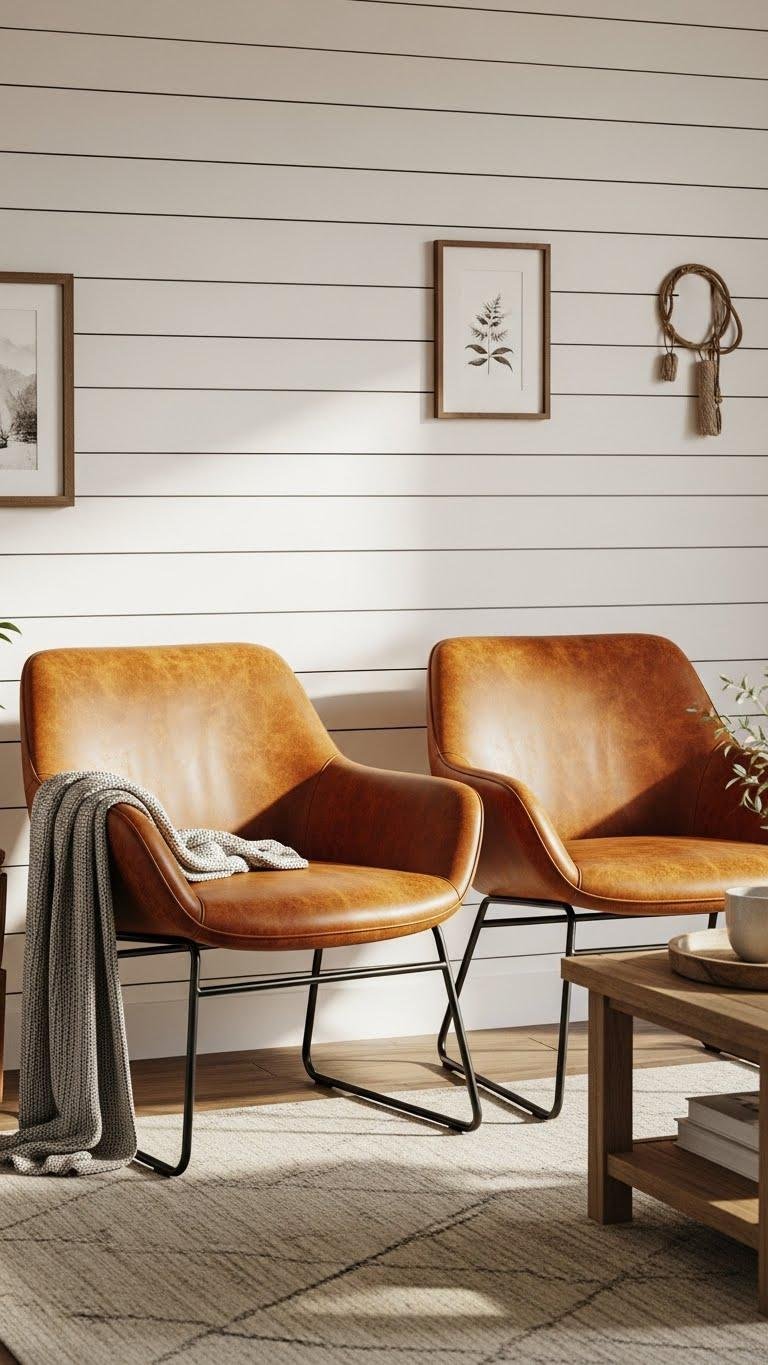 Pairing a reimagined shiplap wall with a pair of caramel leather chairs brings warmth and modernity into perfect balance. You’ll love how a distressed patina and buttery patina read as lived-in luxury, inviting you to kick back. Choose slim, industrial legs to keep the look airy, layer a neutral throw, and let those chairs anchor a free, unfussy farmhouse vibe.