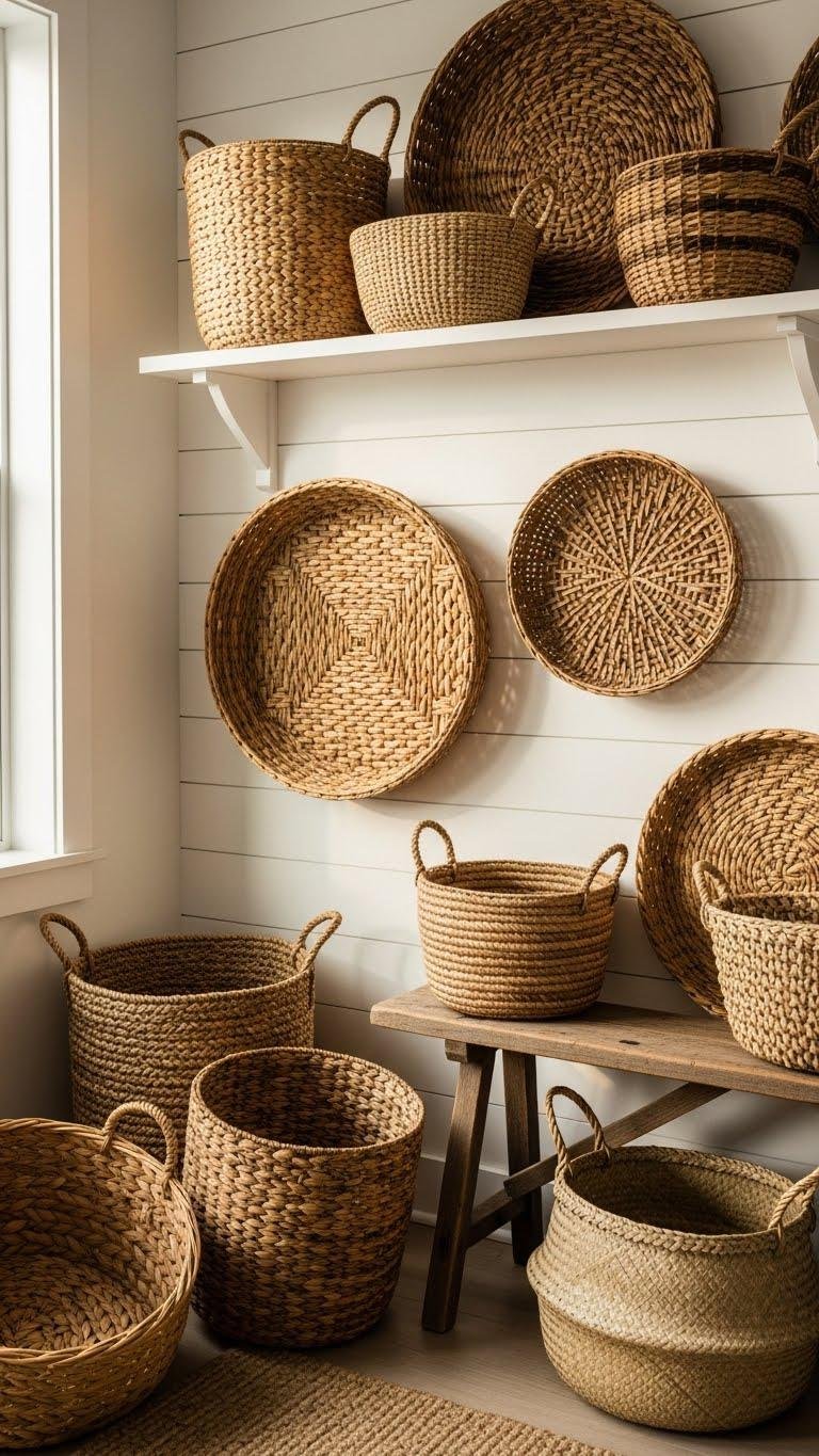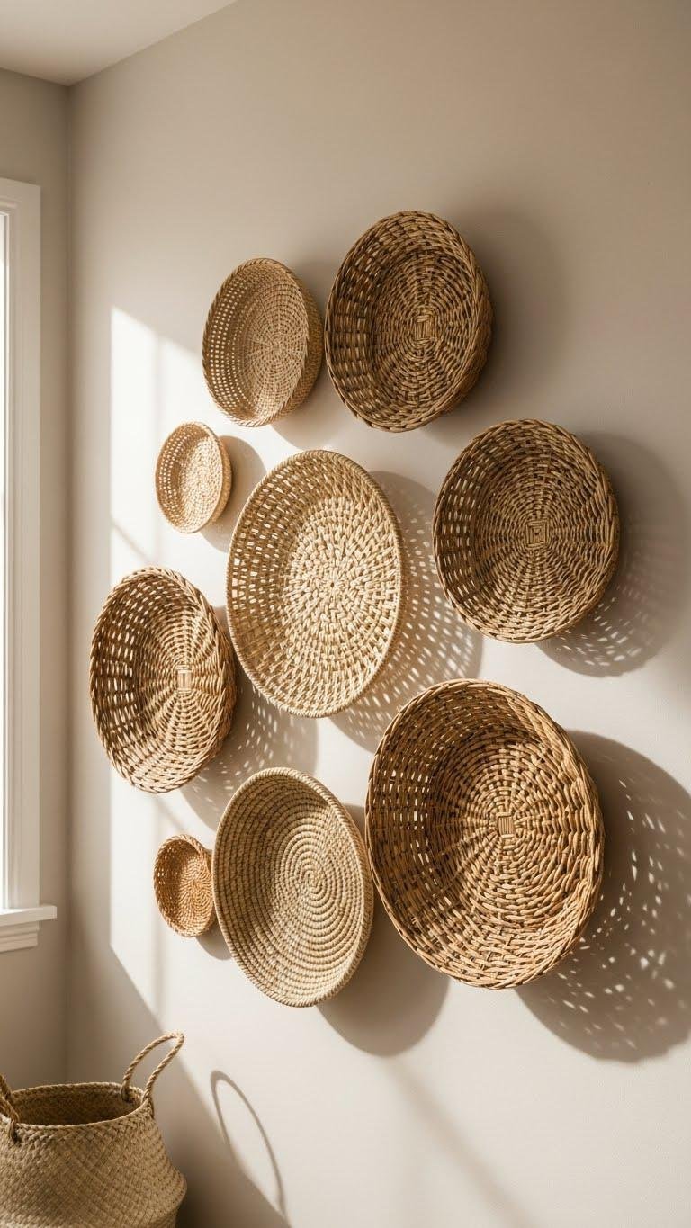 A well-curated wall basket gallery can instantly become the room’s visual center, giving you texture, rhythm, and rustic charm without overwhelming the space.