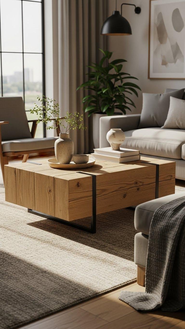 Anchor your living room with a chunky wooden coffee table that balances rustic heft and modern polish. You’ll choose pieces with hewn edges and a low profile that ground seating without overwhelming the space. Opt for sustainably sourced oak or reclaimed pine, matte finishes, and simple metal accents. The result feels rugged, intentional, and effortlessly free — a centerpiece that invites living.