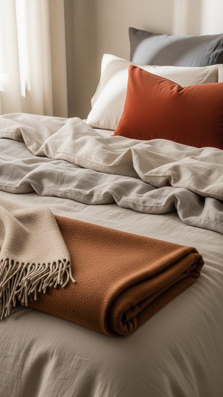 Mix a weighted duvet with breathable linen sheets, add a layered flannel throw for warmth, and choose a neutral palette with one bold accent. You’ll enjoy texture-rich comfort that’s stylish and freeing, easy to change seasonally without fuss.