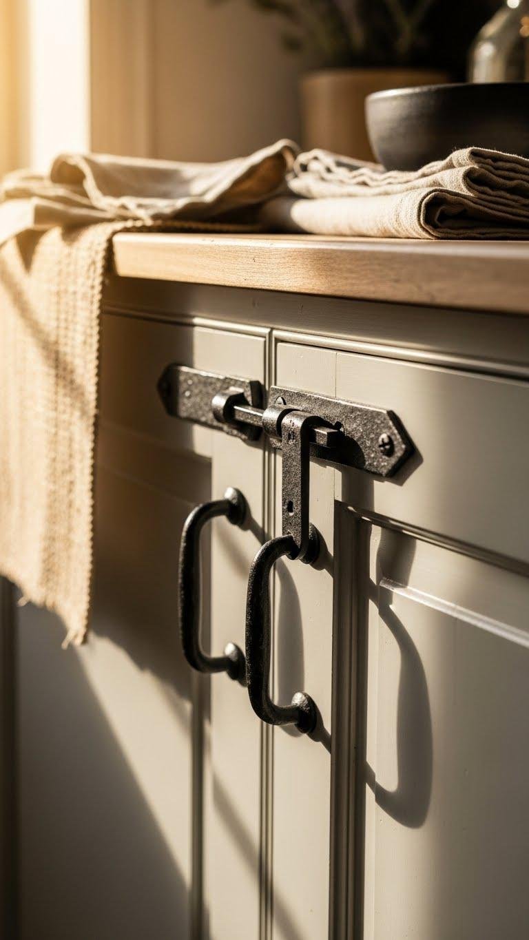 You’ll choose distressed pulls and forged latches to add tactile authenticity and visual weight without overwhelming light finishes.