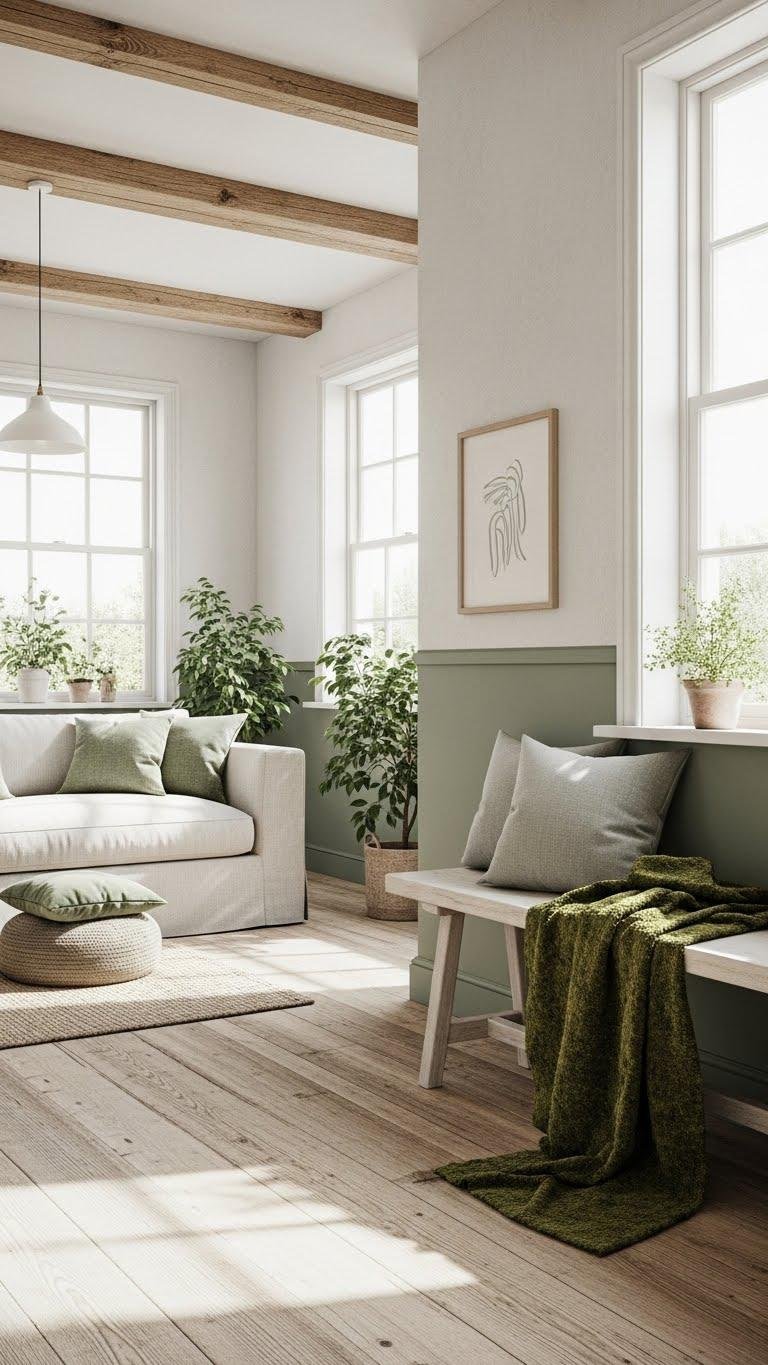 Though a neutral base keeps your farmhouse calm and airy, adding green accents brings life and modern warmth without upending the serene palette. You’ll balance linen, warm whites, and raw wood with sage accents on pillows and trim, plus moss textiles for tactile depth.
