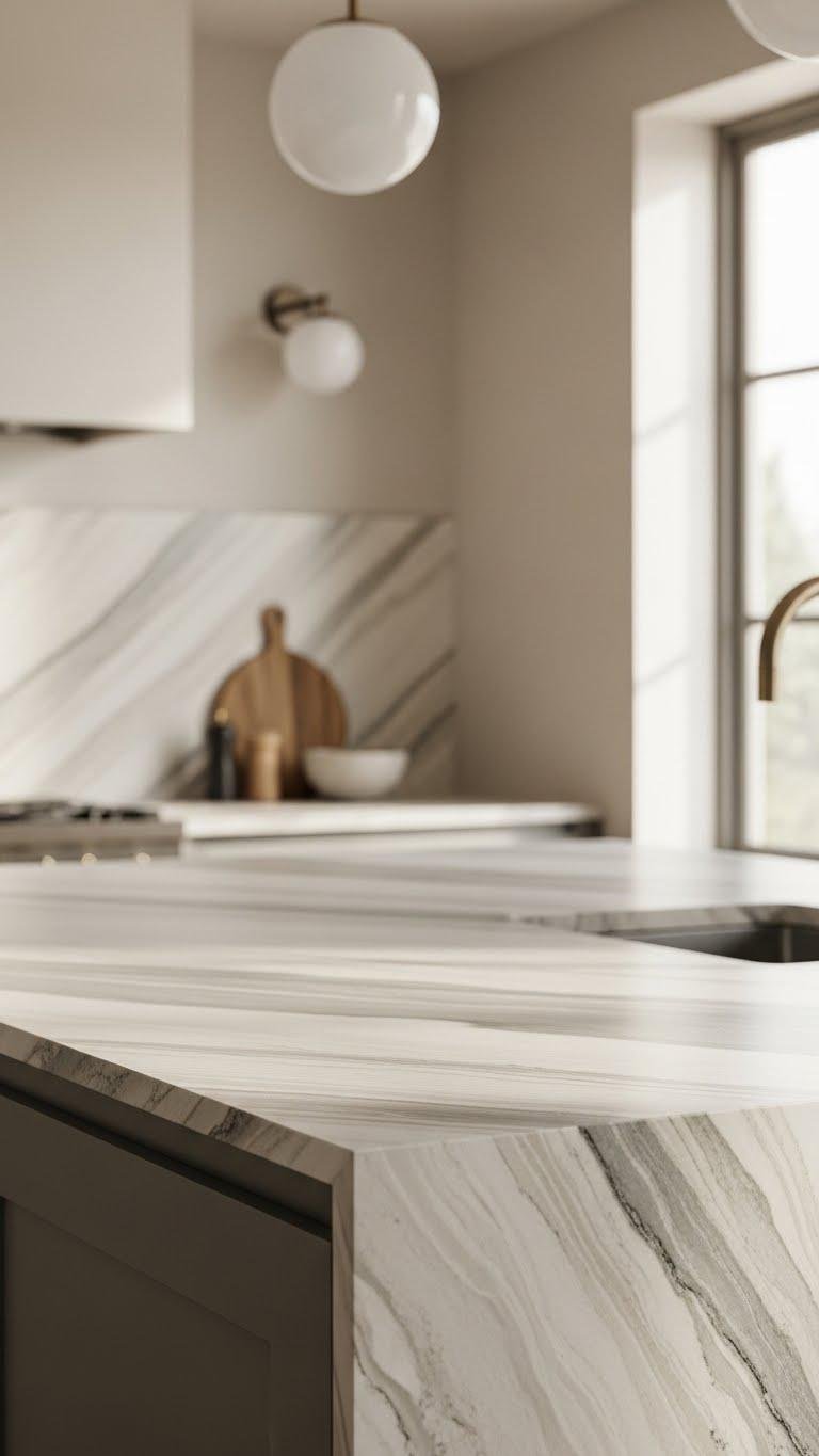 Polish your kitchen with stone countertops that read calm and curated—think honed marble-look quartz or subtle veining in polished granite that adds depth without shouting.
