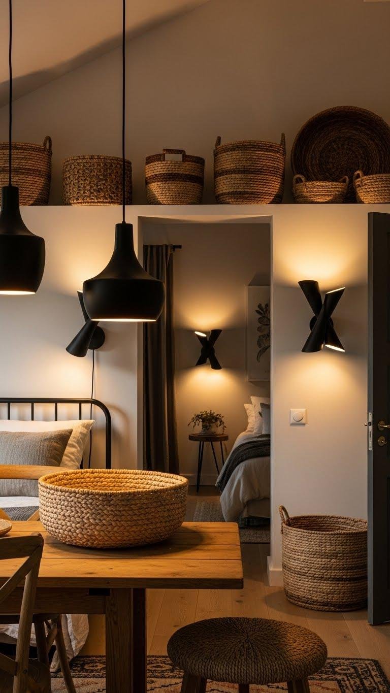 After you’ve warmed a room with woven baskets, introduce matte black light fixtures to add modern contrast and graphic definition.