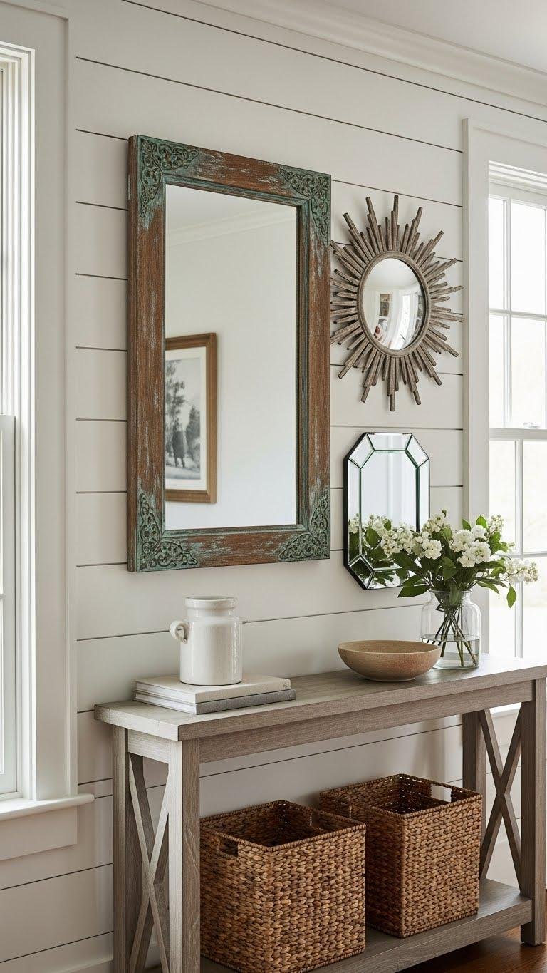 A well-chosen vintage mirror can instantly elevate a farmhouse room by reflecting light, expanding sightlines, and introducing a hint of history—choose a patinated frame, sunburst shape, or beveled glass to add instant character without clutter.