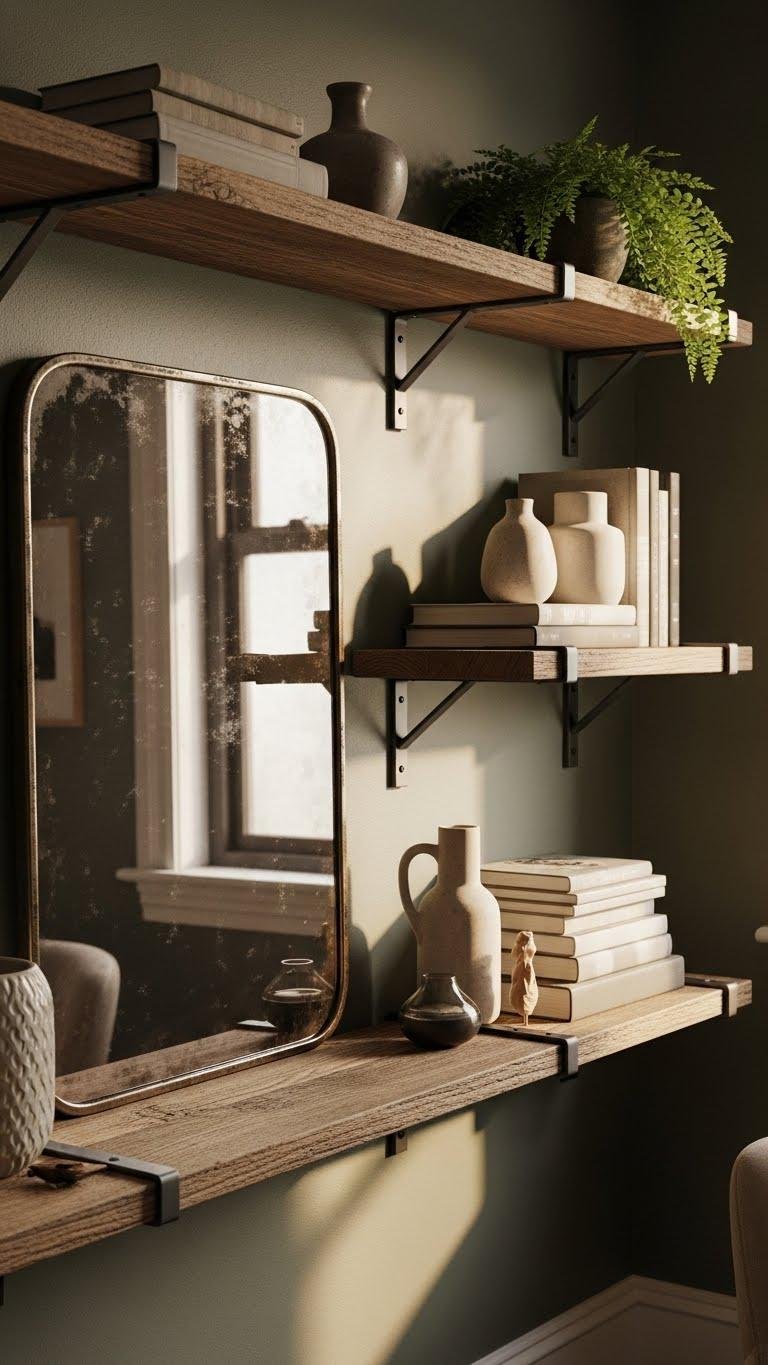 Mirror placement often points you toward nearby shelving choices, and reclaimed wood shelves pair beautifully with vintage mirrors to deepen that lived-in look.