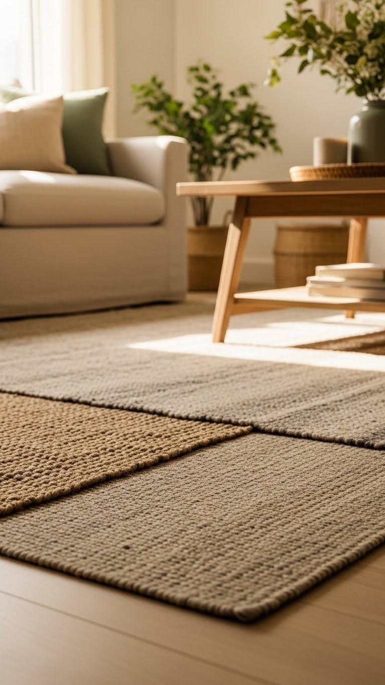 Layering neutral rugs lets you anchor a room with texture and calm without stealing focus from other farmhouse elements. Mix natural jute with a faded sisal layer to add warmth, durability, and subtle pattern.