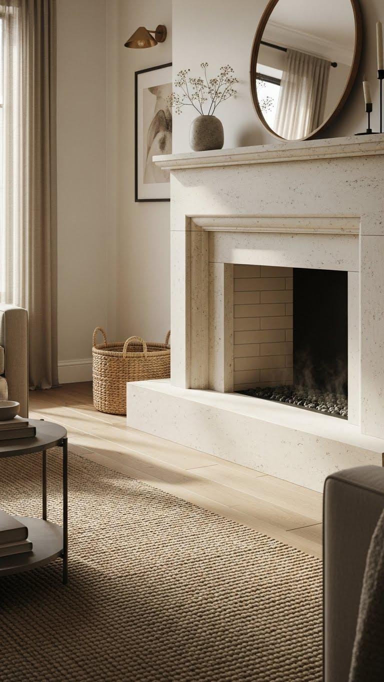 After grounding your floors with natural, textured rugs, shift your focus upward to the fireplace, where a polished stone surround can introduce quiet luxury without breaking the farmhouse calm.