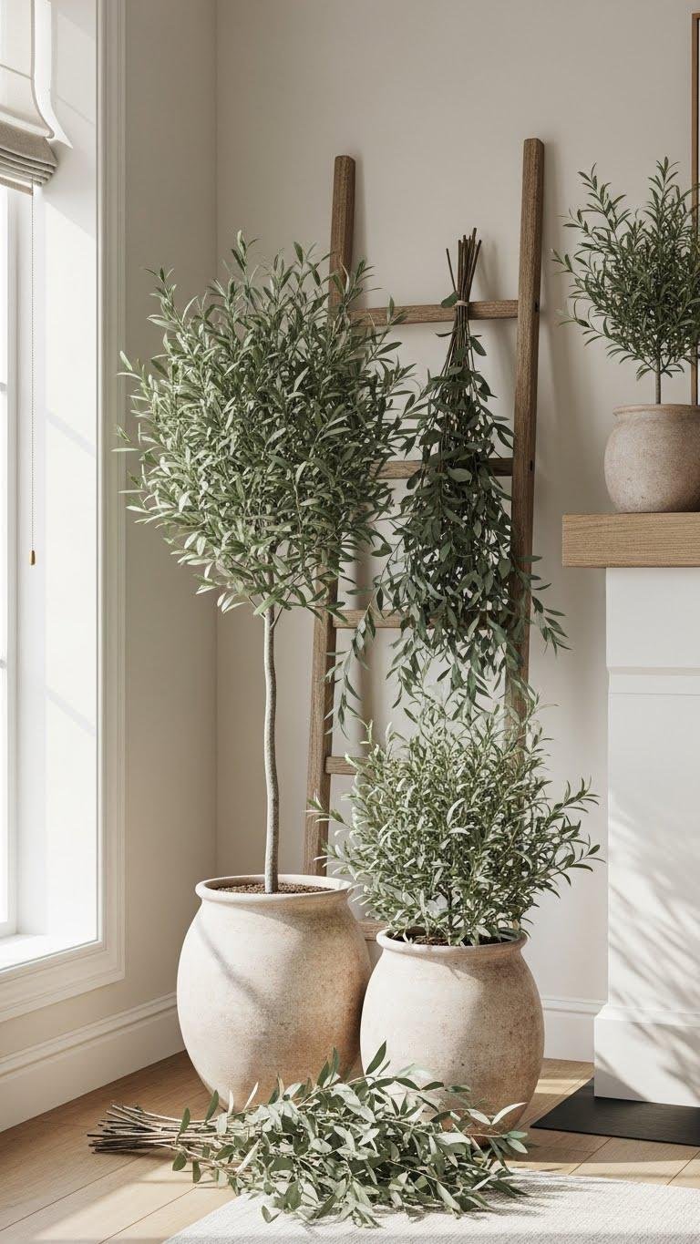 Bring a living, sculptural element into your farmhouse by grouping potted olive trees and eucalyptus stems—both add soft, silvery foliage that reads modern yet timeless.