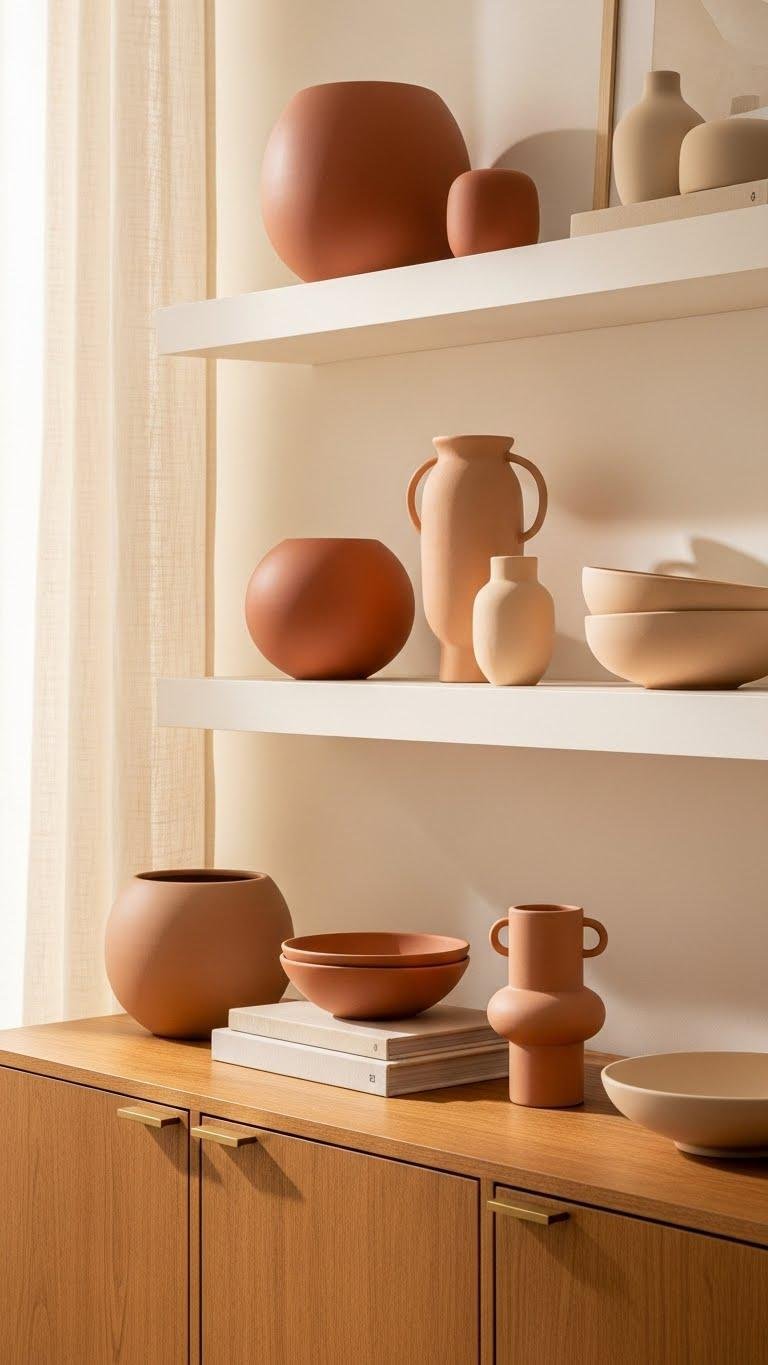 Warm up your farmhouse with soft terracotta accents that read modern and lived-in: think rounded planters, matte vases, and low-profile bowls in muted clay tones that complement creams and warm woods. You’ll mix sunbaked ceramics and muted terracotta pieces to create effortless, breathable spaces. Choose sculptural forms, tactile finishes, and varied scales so each artifact feels personal, free, and unmistakably curated.