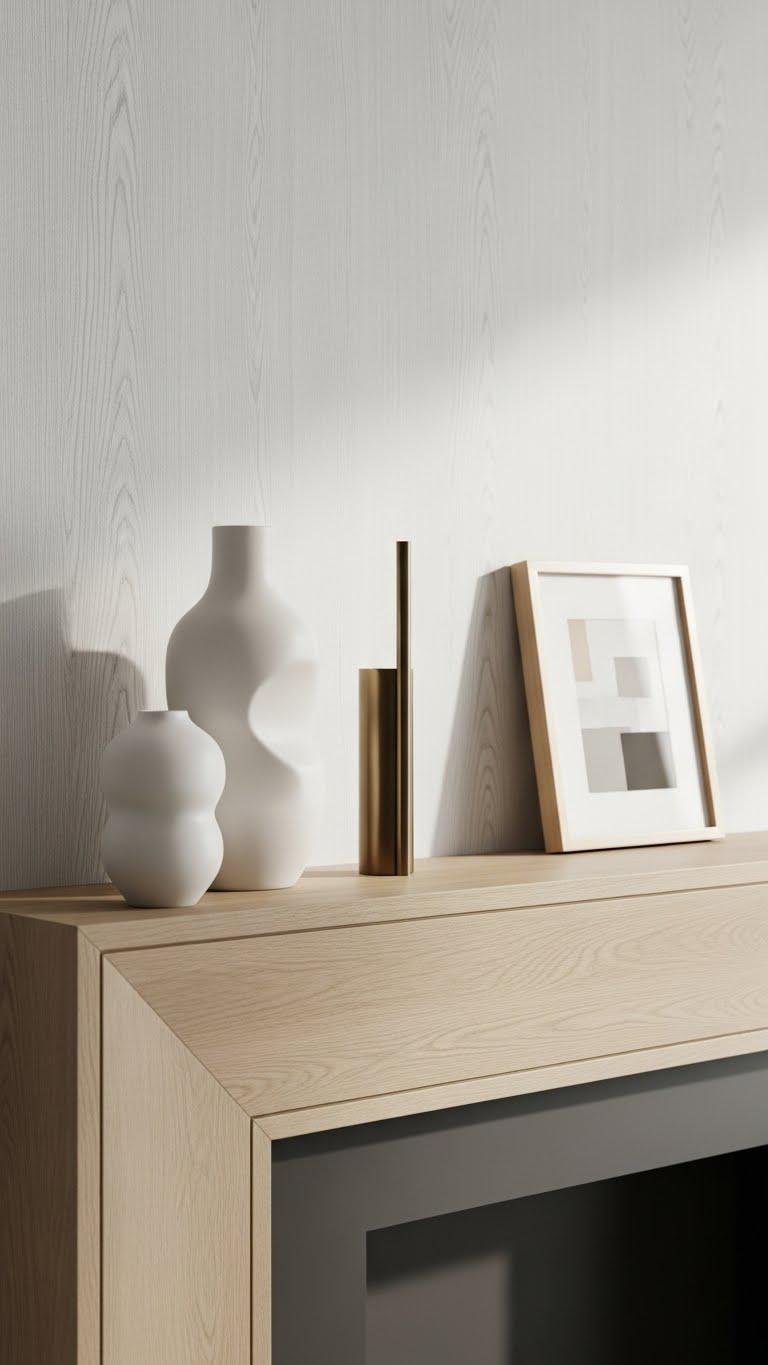 Think of a pale wood mantel as your room’s gust of crisp, Scandinavian air: it calms the eye, brightens low light, and lets simple shapes sing.