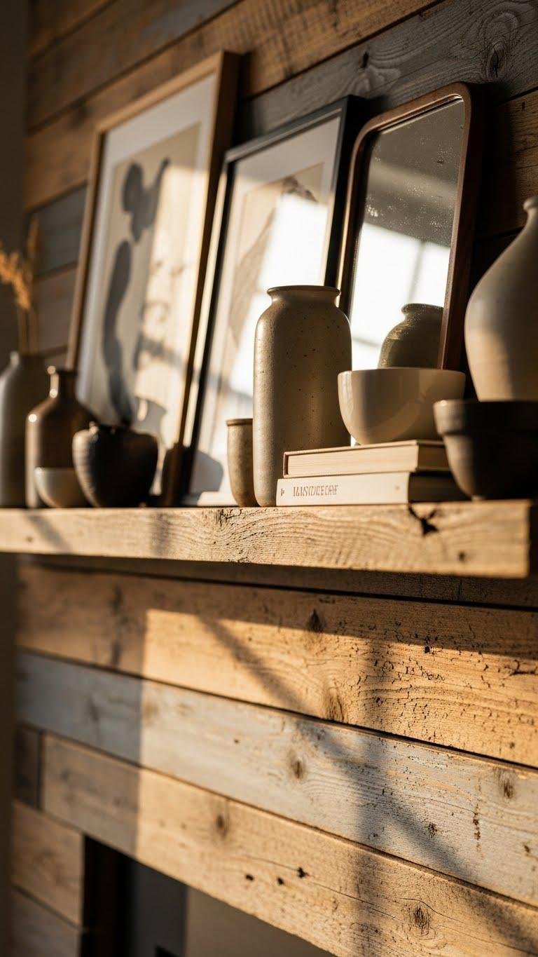 You’ll anchor art, mirrors, and found objects on a raw gallery ledge that celebrates reclaimed textures.