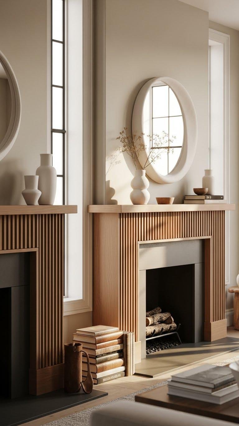Think of a fluted wood mantel as the architectural equivalent of a pleated skirt—it’s refined, tactile, and instantly lifts a room without shouting. You’ll love how the fluted silhouette throws light and shadow, creating sculptural rhythm. Keep styling minimal to let woodgrain contrast sing; pair with airy art and brass accents for a liberated, designer look that feels effortless, not precious.