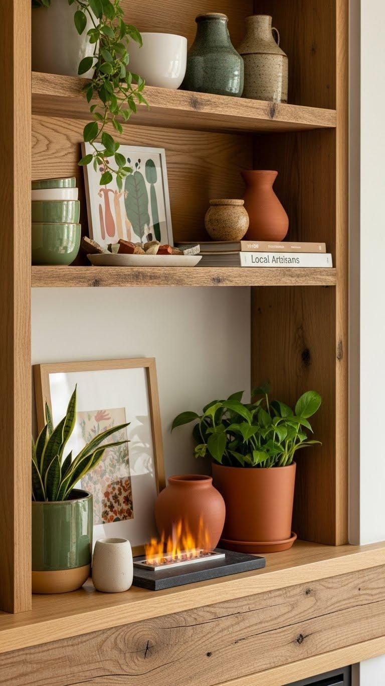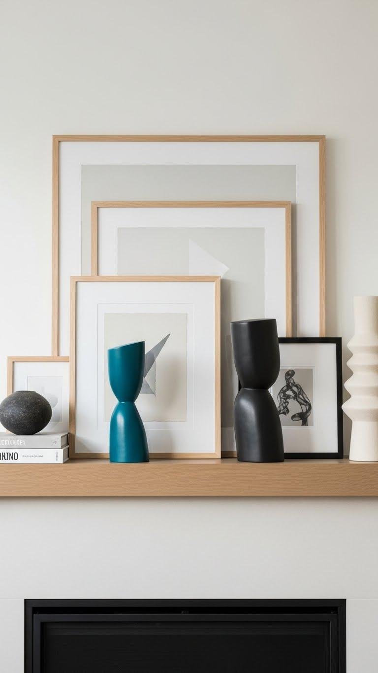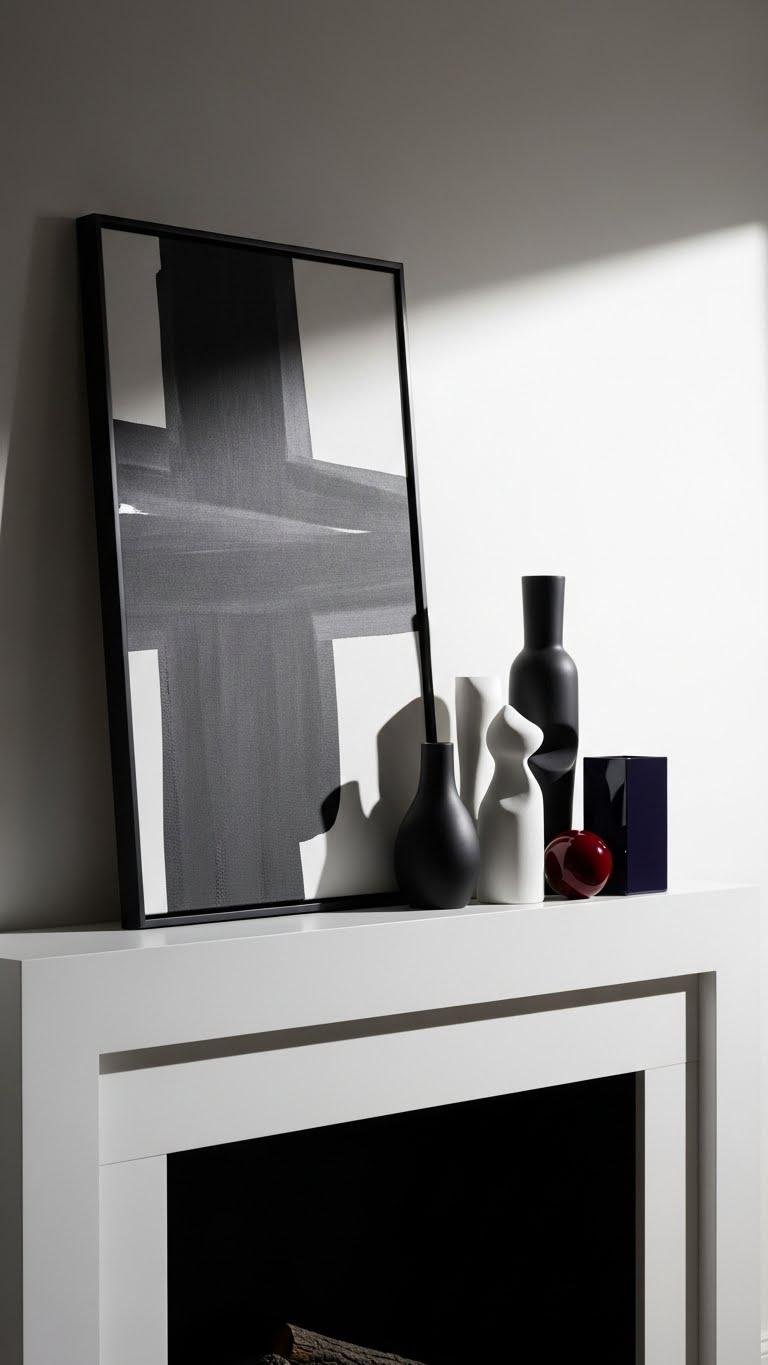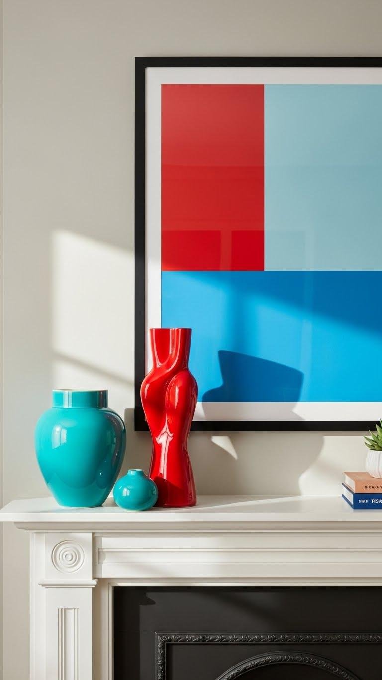 A few bold pieces can turn your mantel into the room’s mood-maker: think a saturated ceramic vase, a lacquered sculpture, or an oversized framed print that anchors the eye and sets the color story.