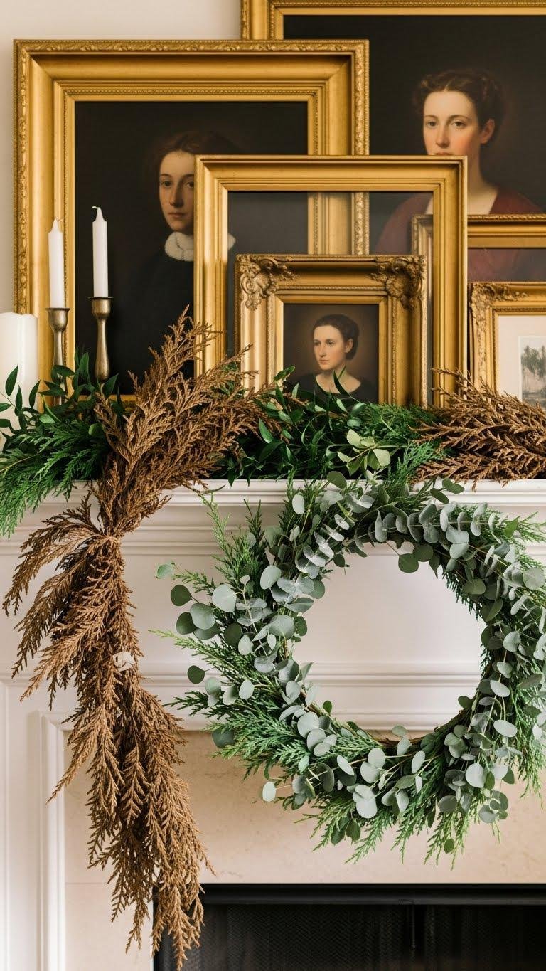 After you’ve mastered that layered, gilt-and-portrait drama on the mantel, bring in seasonal garlands and greenery to soften the formality and add alive, changing texture. You’ll drape a dried cedar garland for rustic scent, swap in an eucalyptus wreath runner for airy eucalyptus flair, and let loose asymmetry, natural drape, and restrained color to keep the mantel stylish, relaxed, and invigoratingly free.