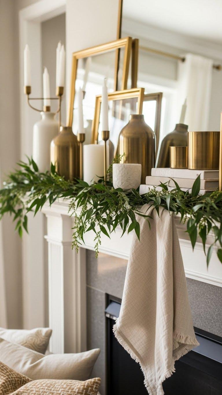 Although you’ve softened the mantel with garlands, you’ll raise the whole vignette by pairing metallic accents with soft neutrals—think burnished gold frames, matte brass candleholders, and pale linen textiles that let the metal sing without shouting. You’ll balance brushed gold pieces against linen neutrals, sketching a liberated, curated look: bold shimmer tempered by calm tones, modern yet effortlessly relaxed.