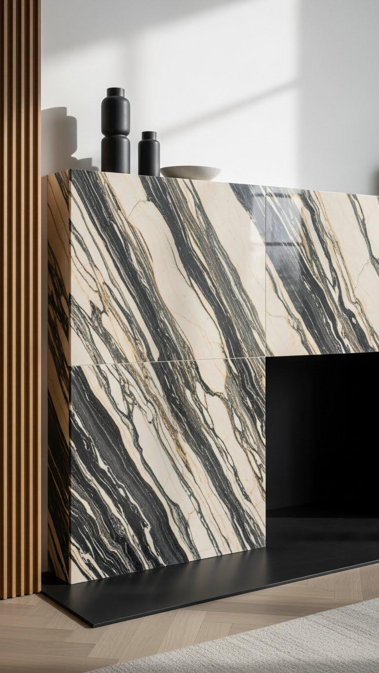 You’ll choose slabs with bold polished veining to make a confident, pared-back statement; the sleek surface reads modern while honoring craft.