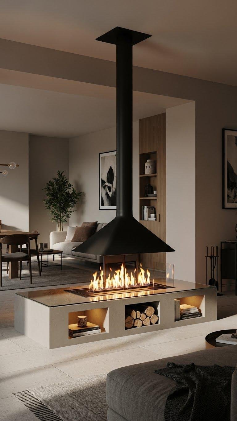 Consider a rotating fireplace for playful flow — it’s bold, freeing, and unapologetically modern.