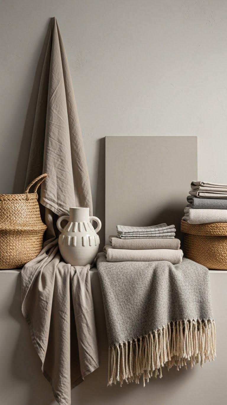 Layer a quiet chorus of neutrals to give your mantel depth without shouting—think oatmeal linen, pebble-washed wool, and matte plaster playing off one another.