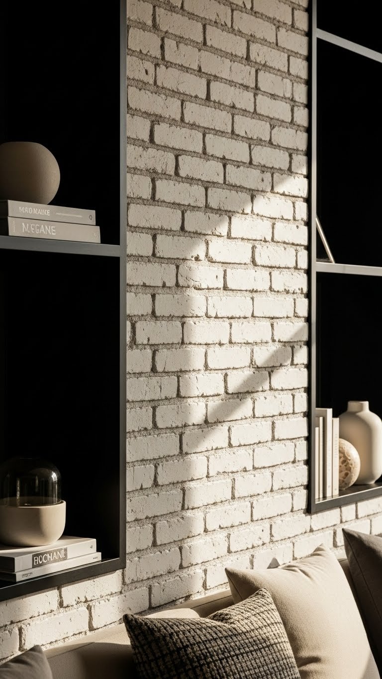 If matte black framing gives you a bold, graphic anchor, whitewashed brick will soften the scene and invite tactile warmth.