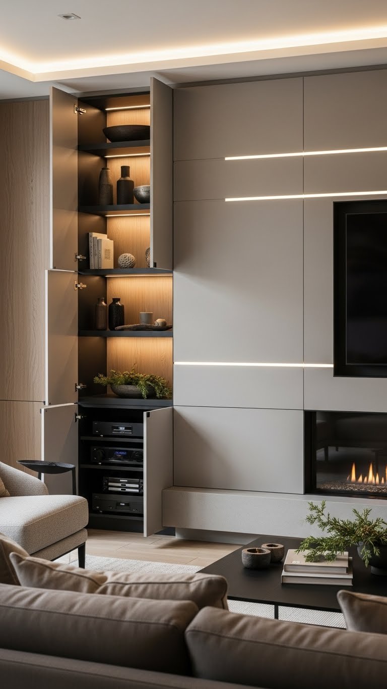 Bring together entertainment and elegance with a media wall that conceals clutter without hiding craftsmanship; integrated storage, recessed shelving, and seamless paneling let you streamline audiovisual gear, cables, and seasonal décor so the fireplace remains the focal point.