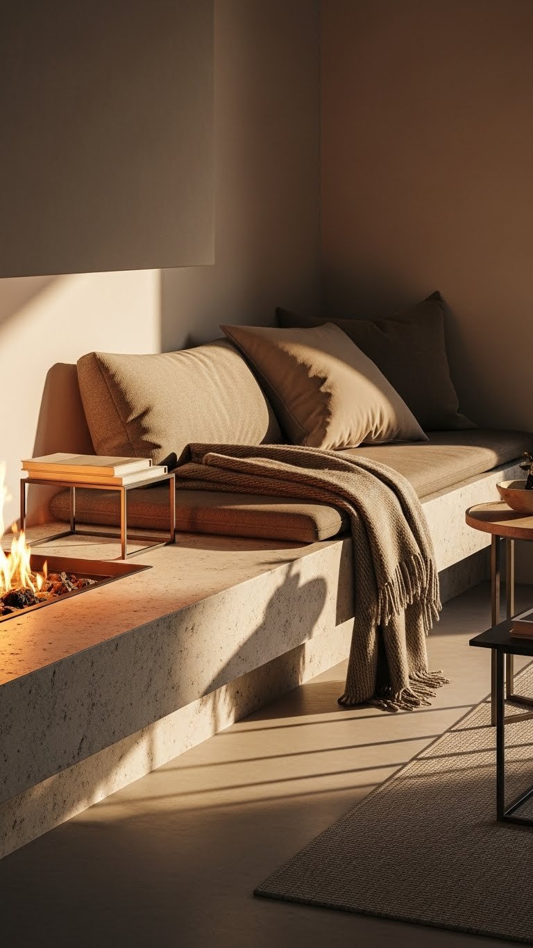 You’ll customize this inglenook seating with cushions in rich neutrals, layered throws, and slim side tables, creating an unfettered retreat where the stone bench feels both modern and timeless.