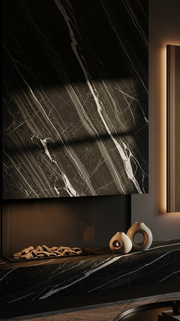 Evoking cinematic drama with polished depth, a black marble surround turns your fireplace into a moody luxury statement that balances glamour and restraint. You’ll relish matte veining that reads like fine art, pairing with moody lighting to sculpt shadows and invite slow evenings.
