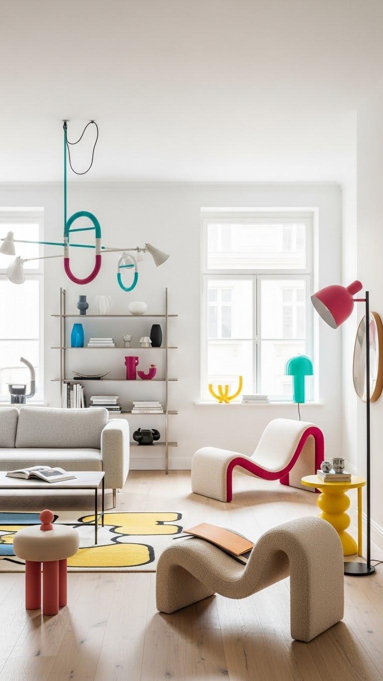 Choose sculptural lighting, graphic rugs, and tactile postmodern textures to break minimalism without chaos.