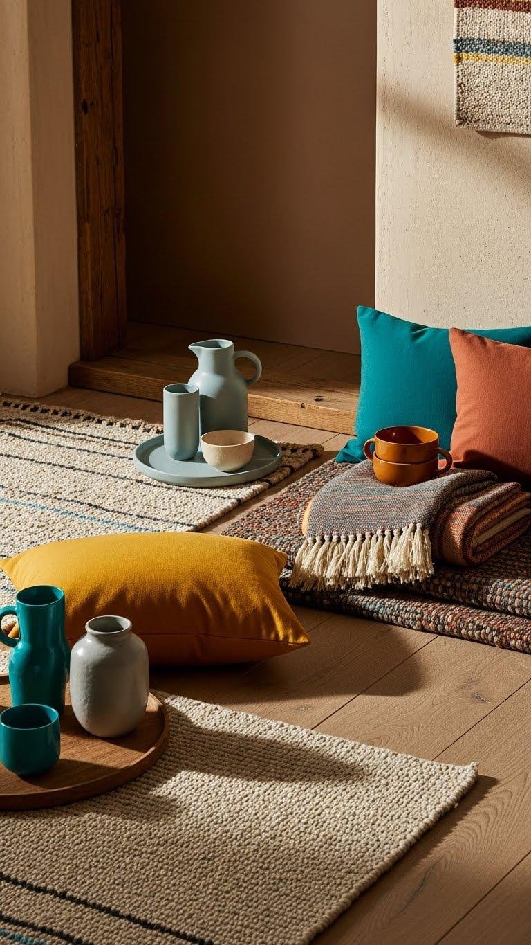 When you layer natural, textural finishes—think nubby wool rugs, raw-hewn wood, and hand-troweled plaster—you create a tactile foundation that makes colorful accents sing.